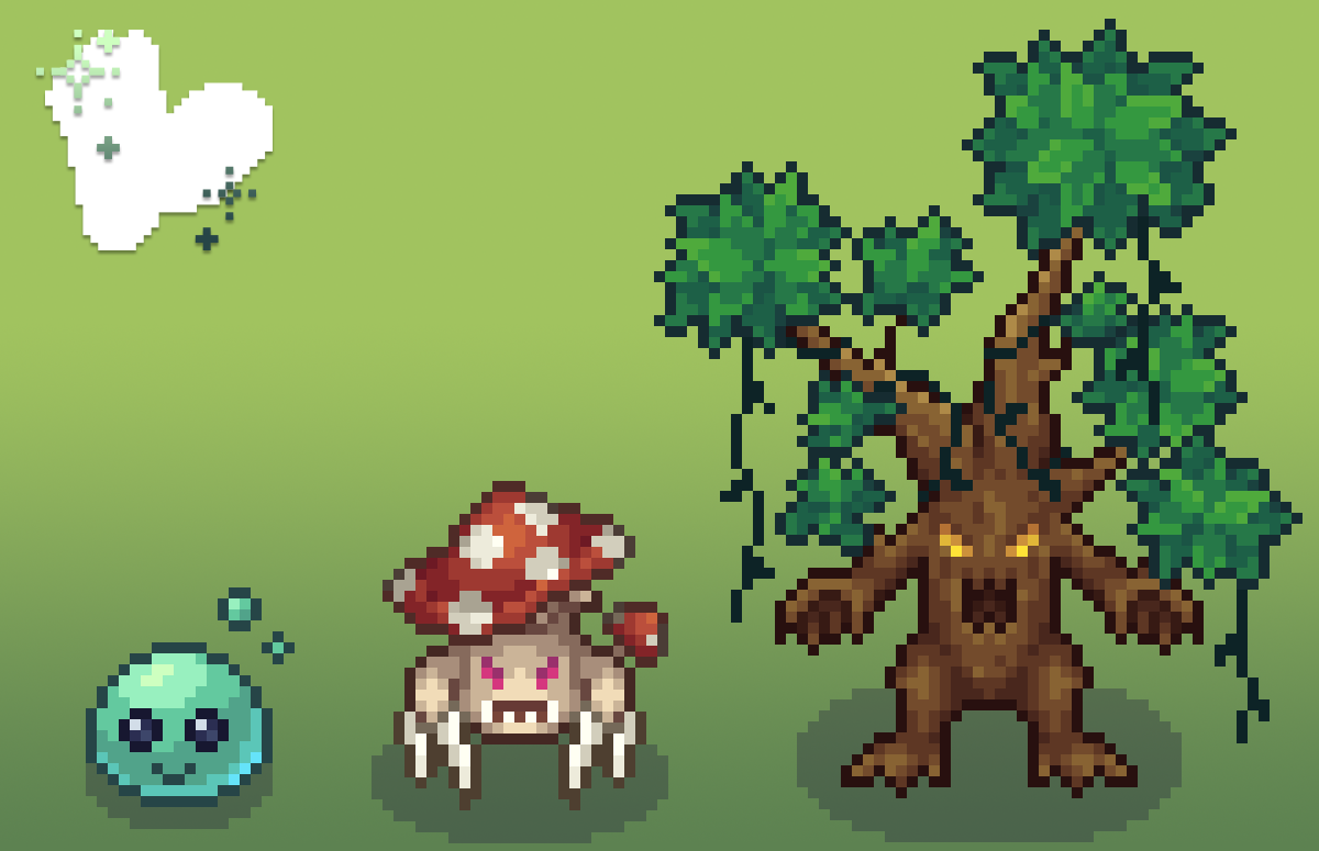 Each region will include three dungeons, each with a few enemies waiting for you. We want to make sure that every monster presents its unique challenges to the player. Initially we want to differentiate monsters by their stats primarly. We have ideas to add different types of damage that could fit nicely with the enemy, for example by having a toxic mushroom enemy do poison damage over time whenever it critically strikes.